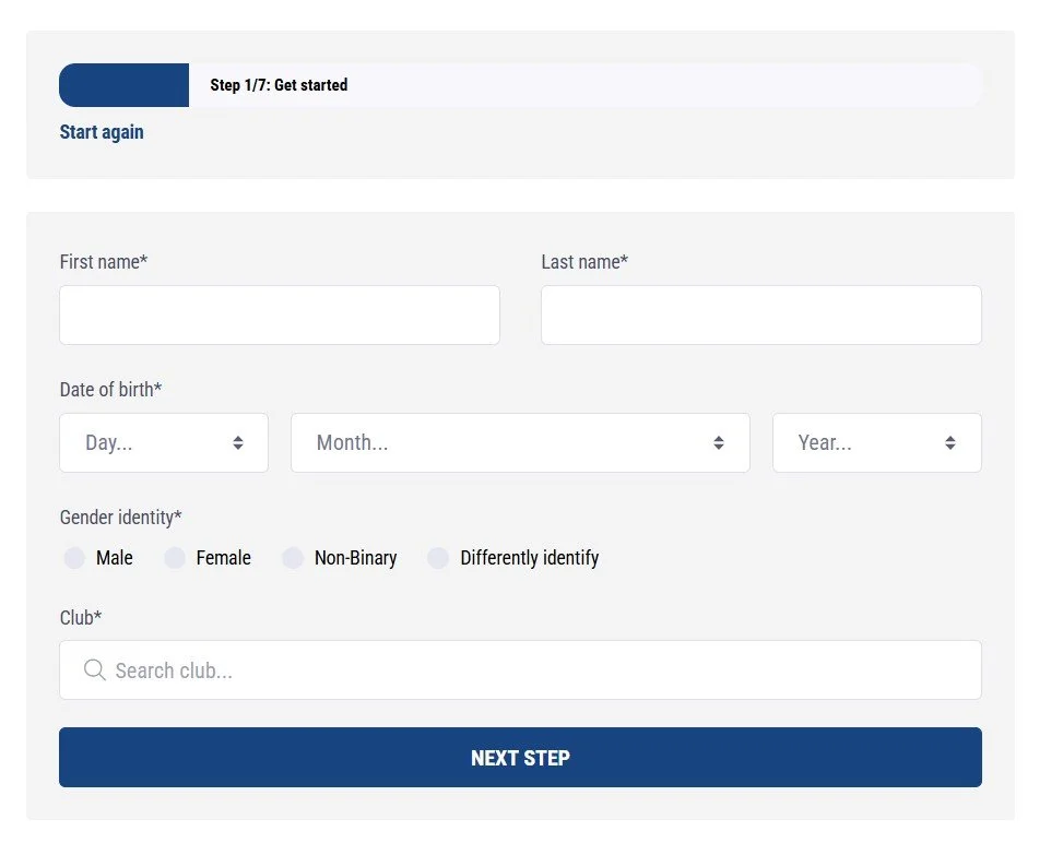 Type your name, date of birth, gender and search “Kim’s Training Centre” for the club option.