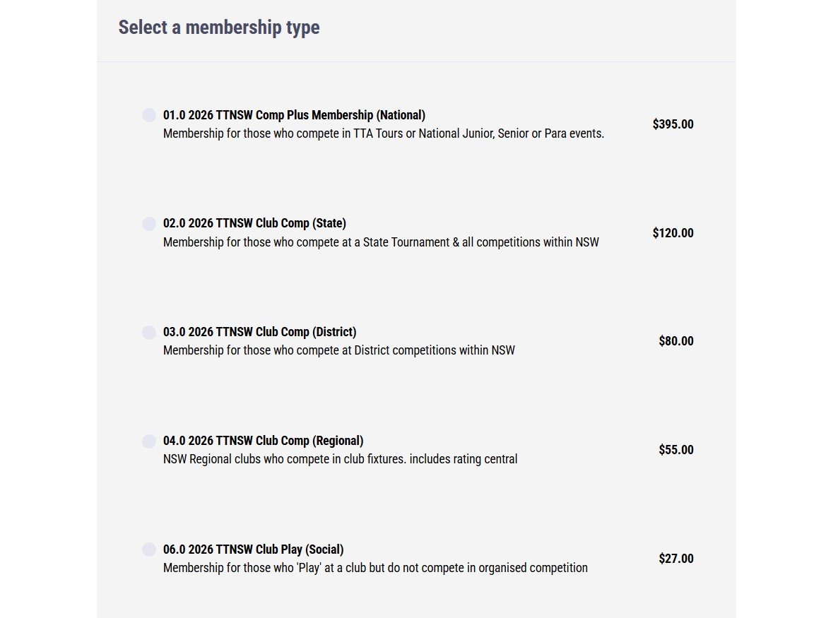 There are numerous membership types, choose one that fits you. If you are looking to play competitions only in NSW then choose “2026 TTNSW Club Comp (State)”. If you are looking to play national competition outside of NSW then choose “2026 TTNSW Comp Play Membership (National)”. All other types of membership below offer the limited competitions, you may end up paying extra.
